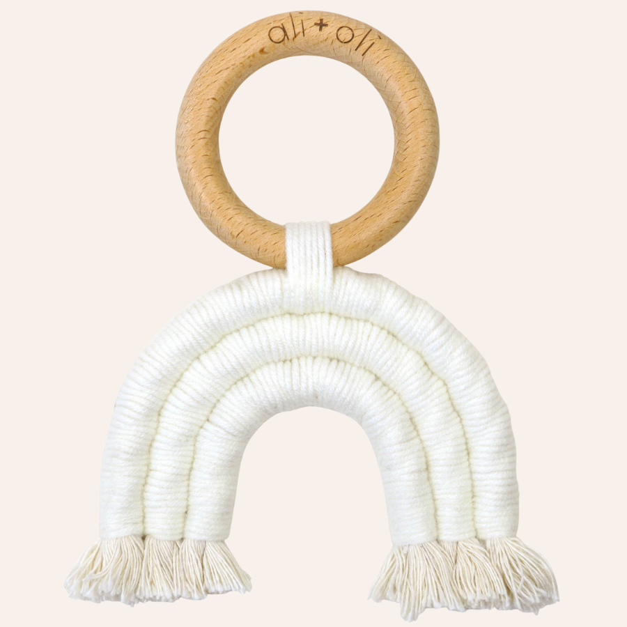 This gorgeous macramé rainbow with a beechwood ring can be used as nursery wall décor or as a teething toy for your little one. The easy-to-grasp ring is made with all-natural untreated 100% FSC certified beechwood, and the macramé is wrapped in 100% cotton yarn and stuffed with biodegradable corn fibers.