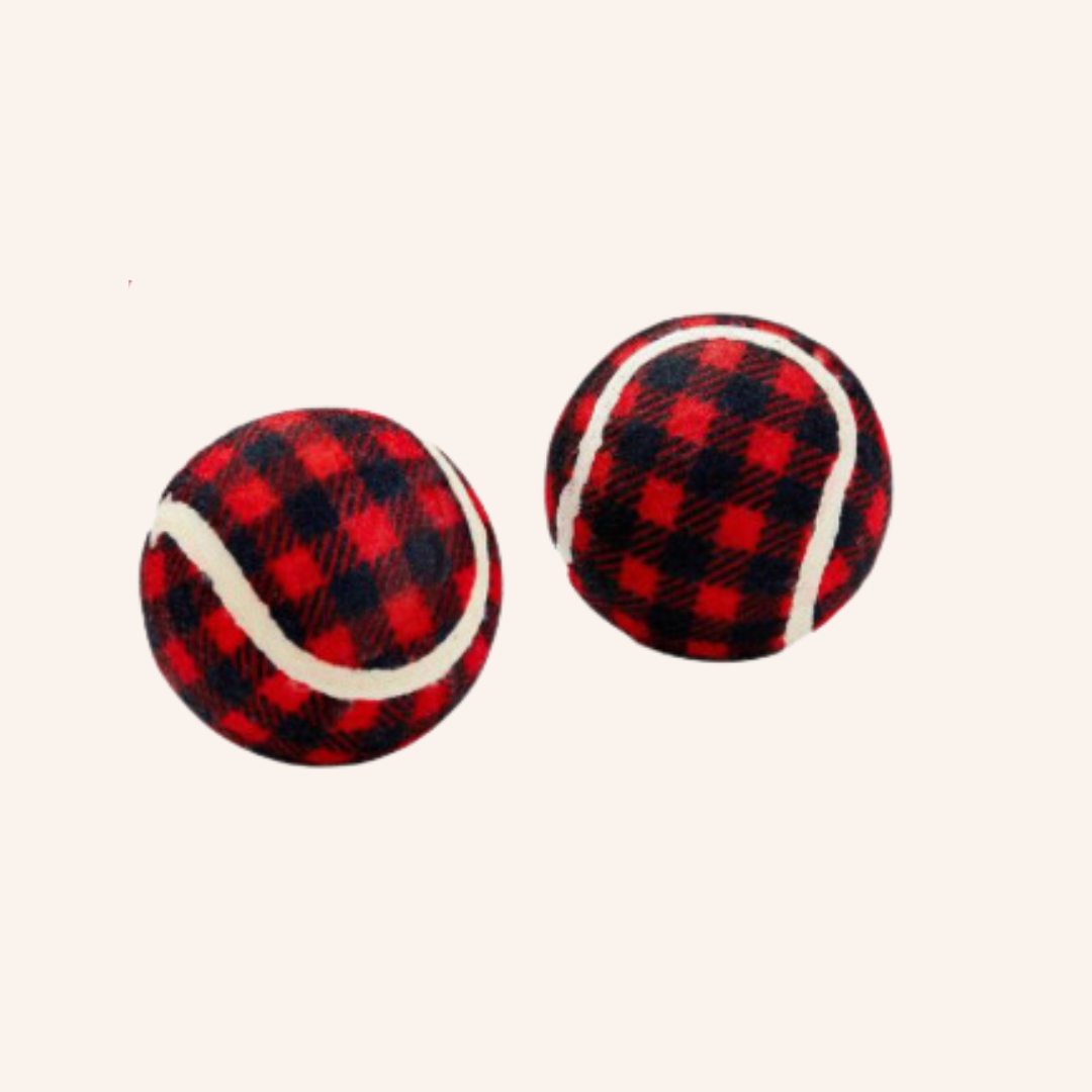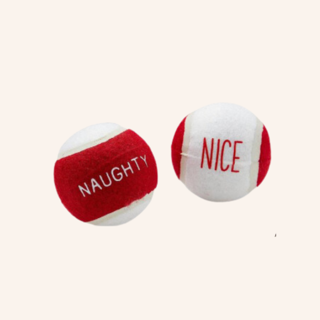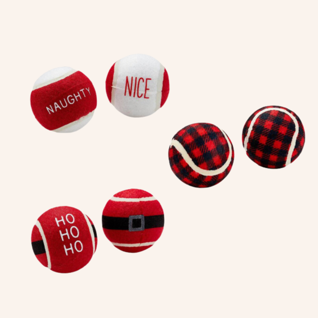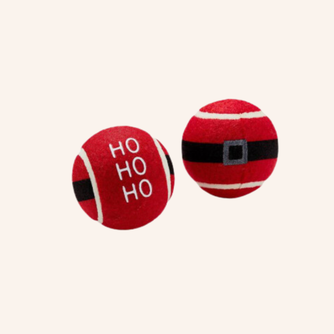 Printed Christmas themed tennis ball wrapped in cello arrives in grainsack display bucket.