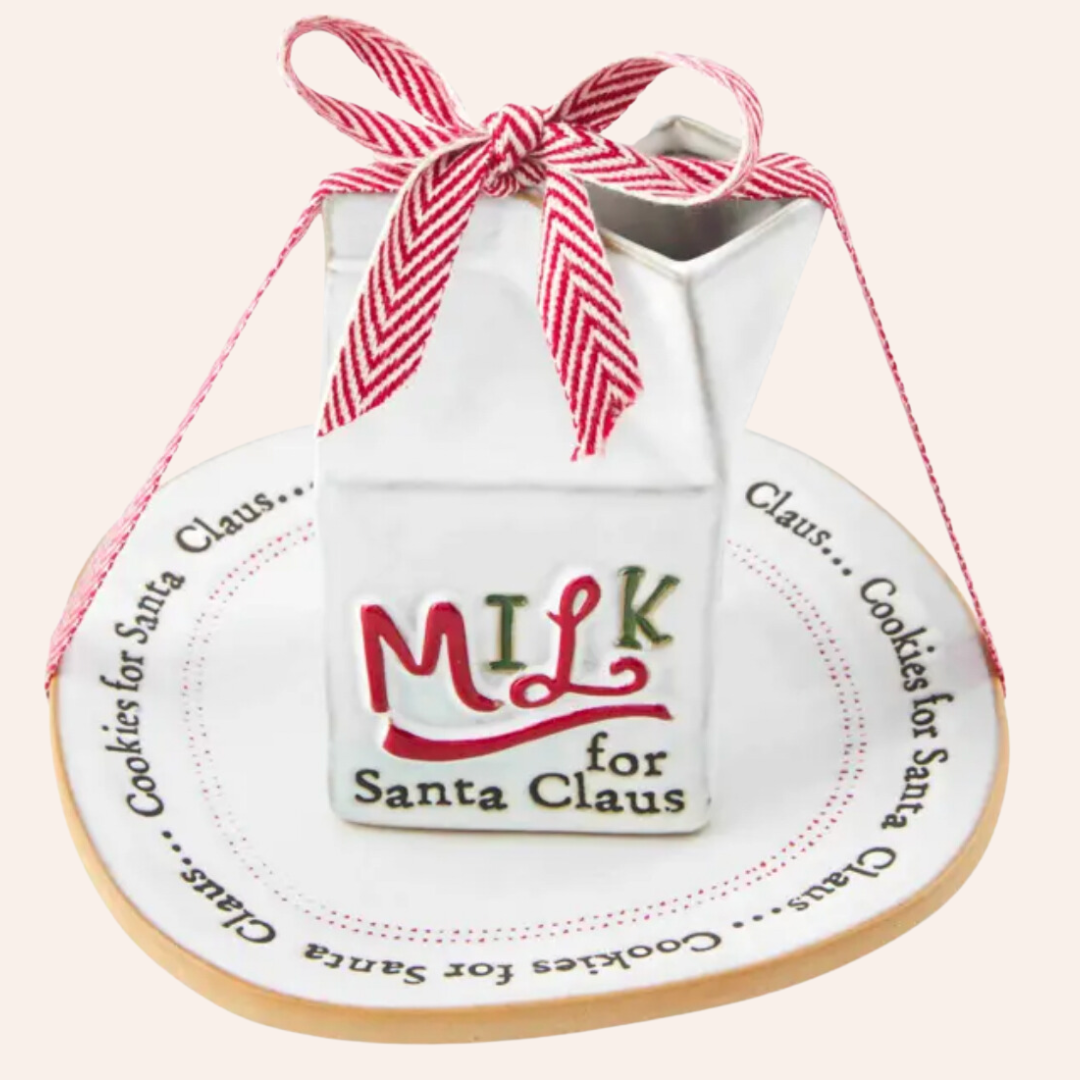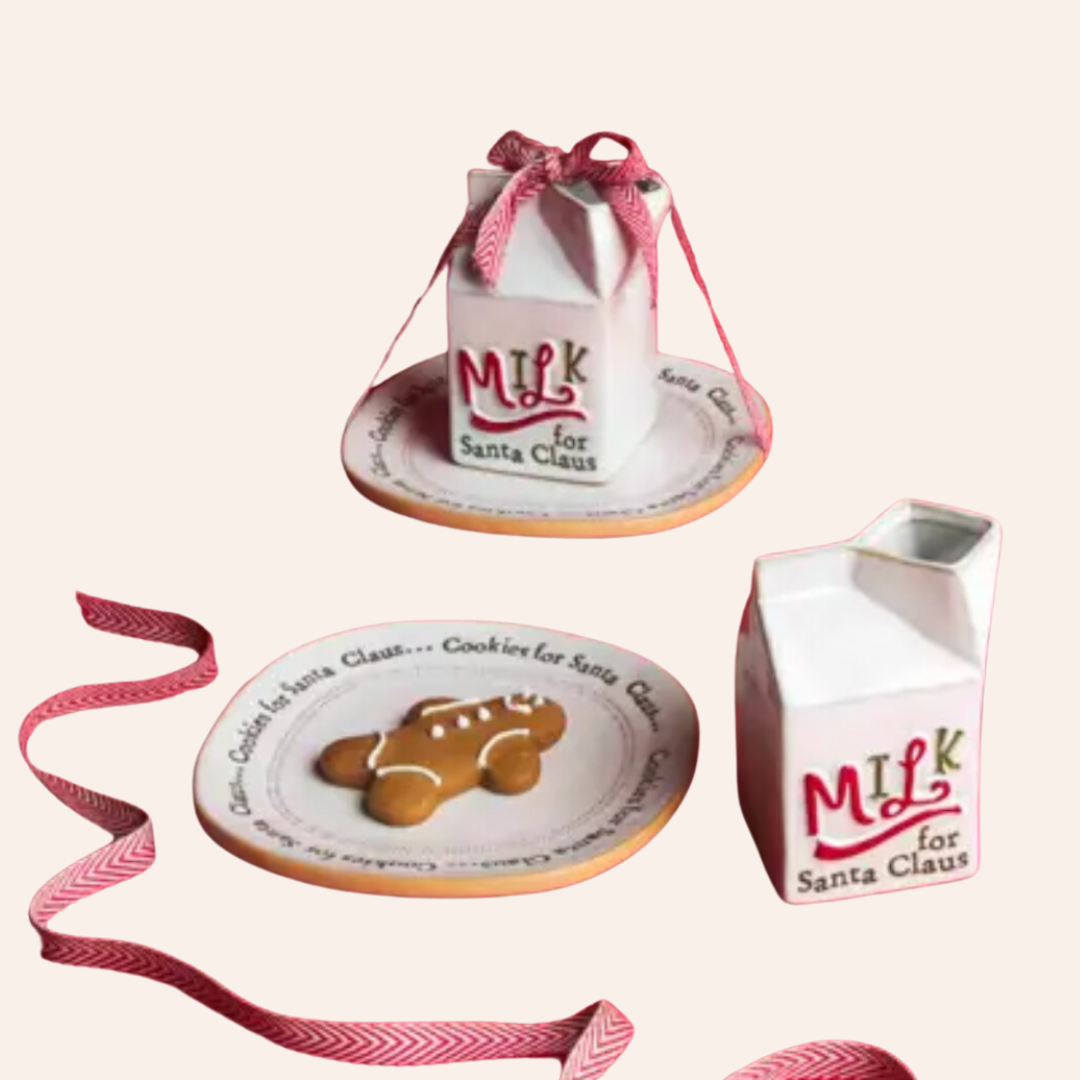 2-piece set. Textured glazed stoneware milk carton. Comes with coordinating cookie plate.