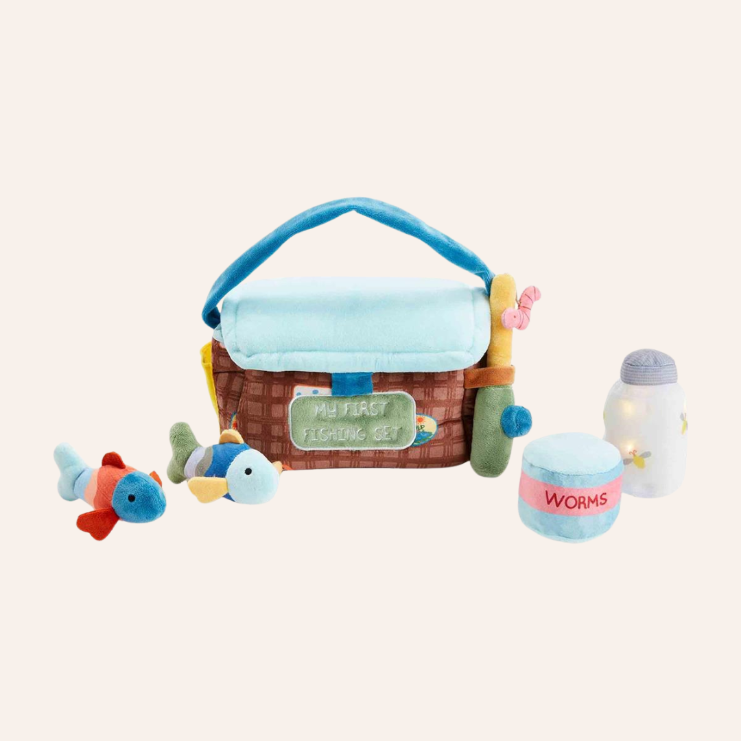 Your fishing buddy needs this super cute Fishing Plush Play Set. The six-piece set includes a tackle box, a fishing pole, two fish, a can of worms and a jar of fireflies. The fireflies even light up inside their jar! This fishing plush play set is intended for children 18 months and older.
