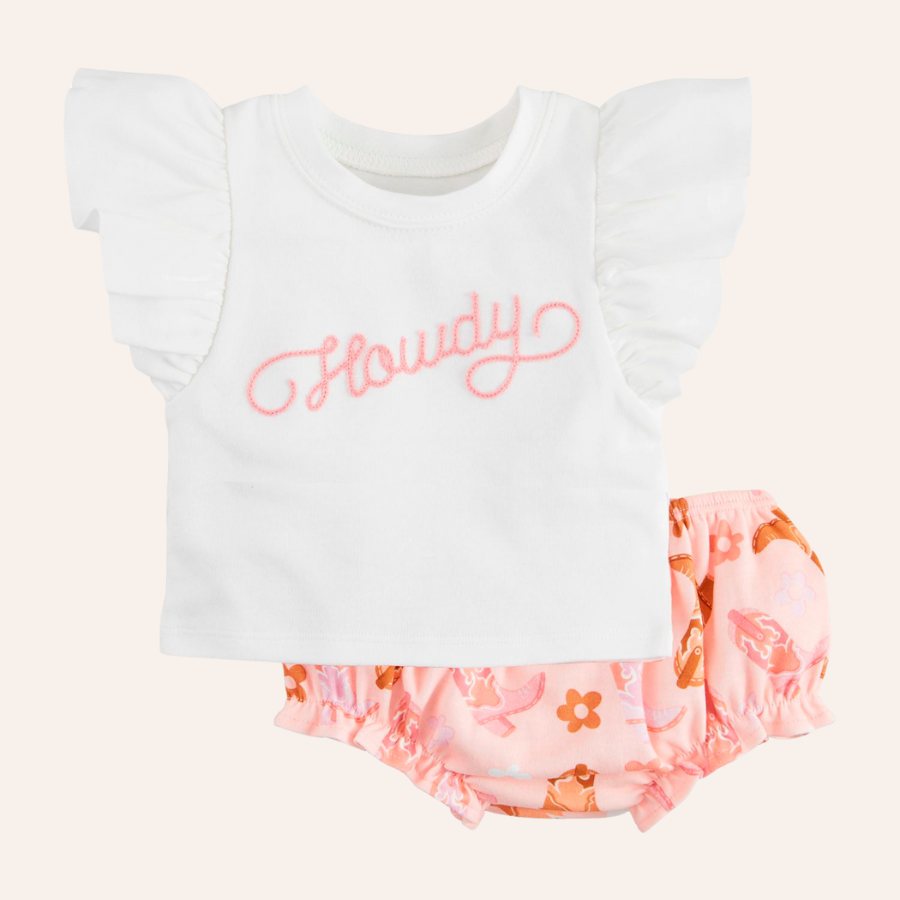 The Howdy Knit Pinafore Set is a charming 2-piece ensemble designed for your little one. This delightful set features a cotton interlock pinafore adorned with flutter sleeves, adding a touch of whimsy and elegance. The intricate chainstitch embroidery enhances its appeal, making it a standout piece in any wardrobe. Accompanying the pinafore are coordinating bloomers, ensuring a complete and stylish look. Crafted from 100% cotton, this set promises comfort and breathability, perfect for delicate skin. Available in size 6-9 months, it offers both style and practicality for everyday wear or special occasions.