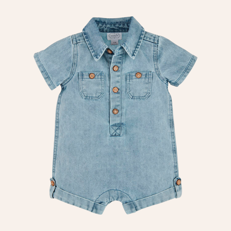 Upgrade your little one's style effortlessly with our Denim Baby One Piece. This cute short sleeve outfit features a wood button front and handy chest pockets, all in a delightful light-wash design. Changing is a breeze with the inner leg snaps. Taking care of this outfit is a breeze too - simply turn it inside out and machine wash cold with like colors. For added convenience, tumble dry low. If desired, a touch of cool ironing can be done. Crafted from a comfortable blend of 50% Cotton, 25% Polyester, 22% Rayon, and 3% Other fiber, this outfit ensures lasting comfort. Dress your baby in both fashion and comfort with ease.