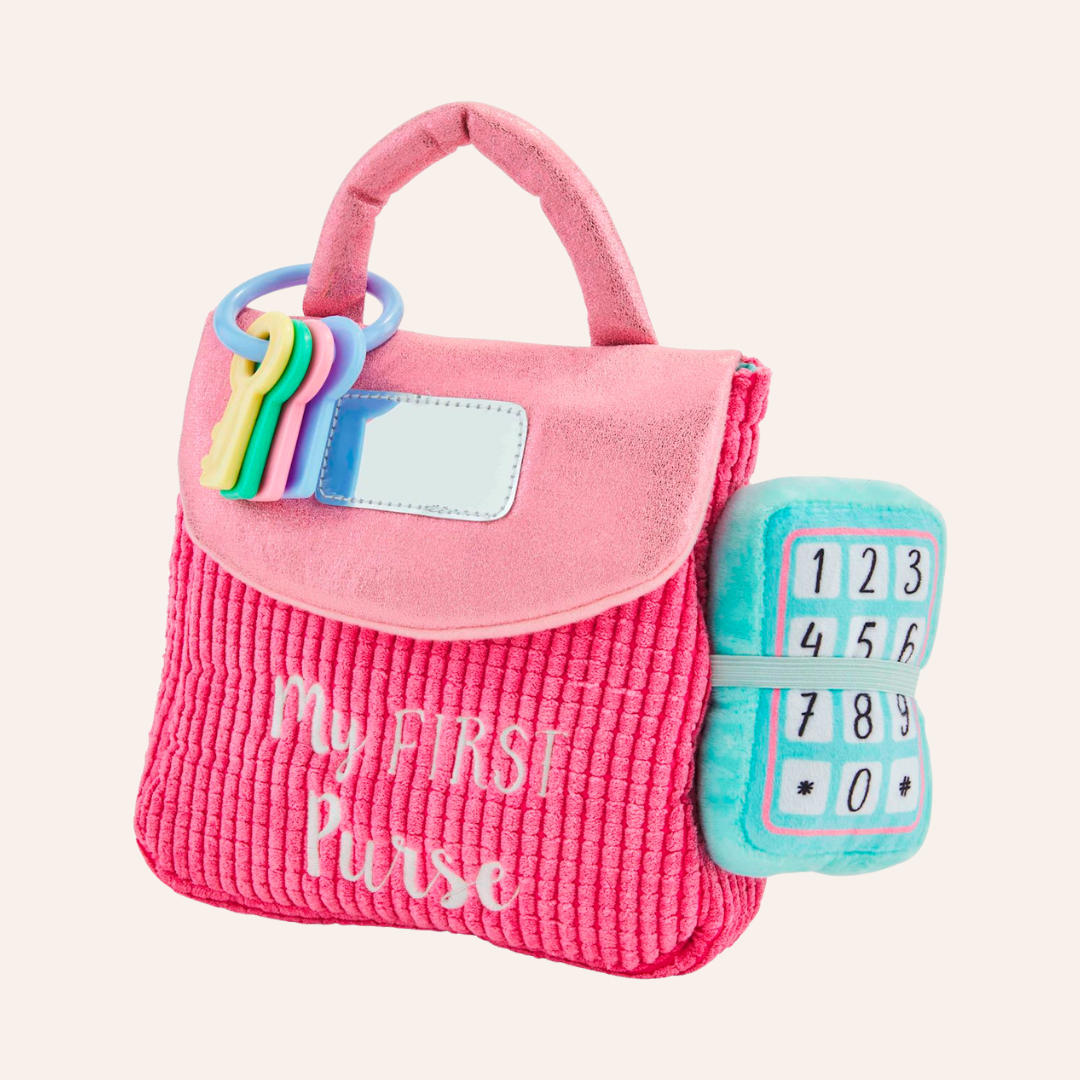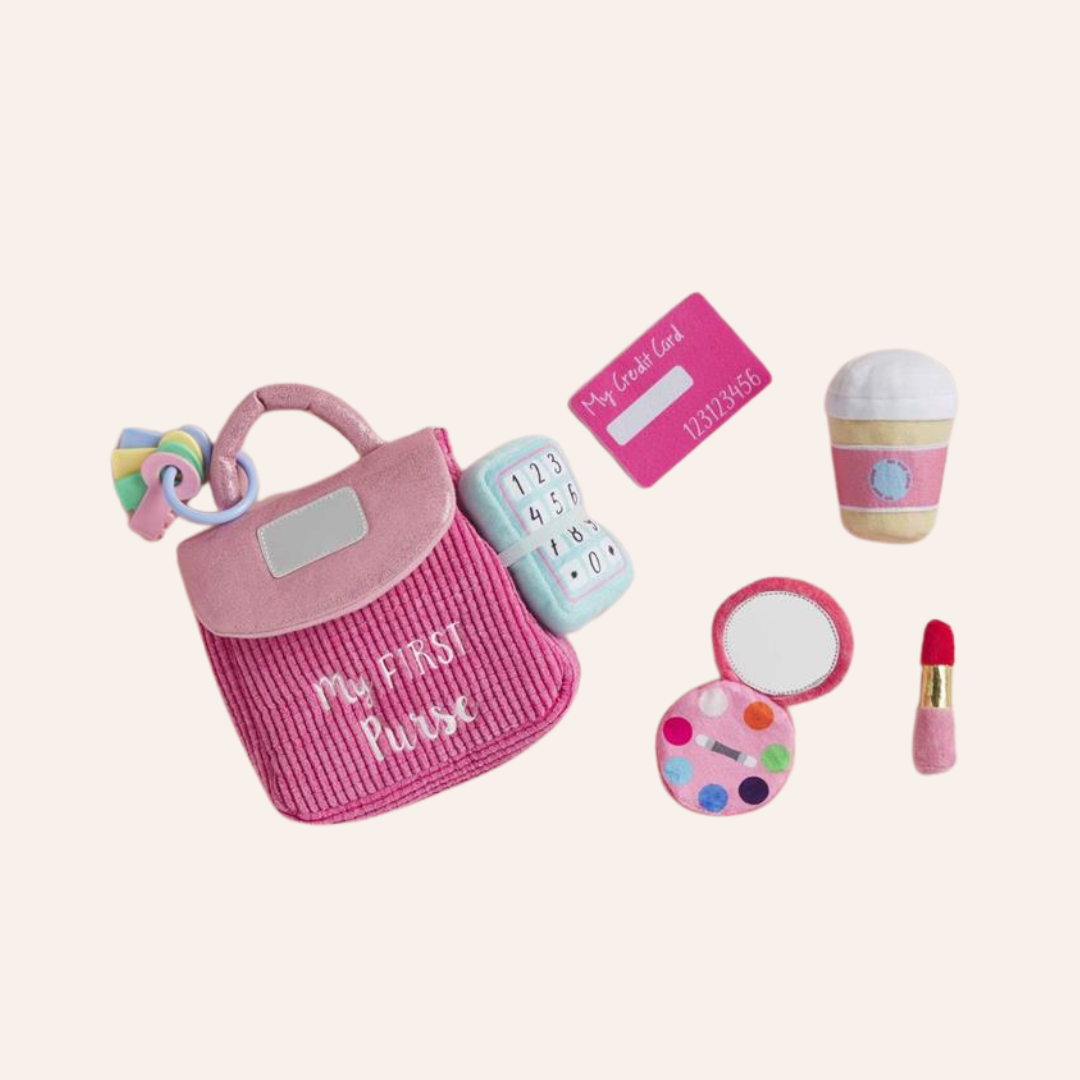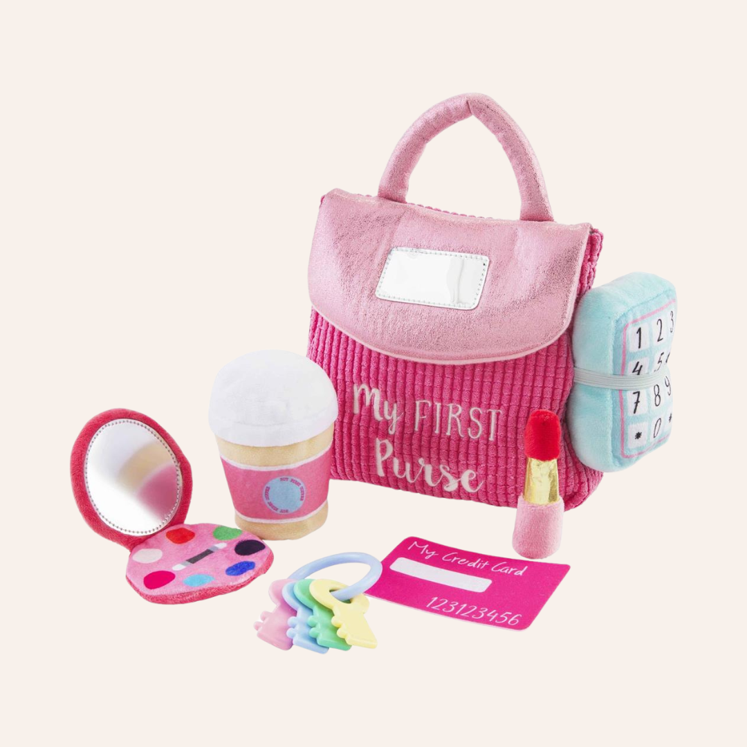 The life-like toys in our My First Purse set will have your child pretending to be Mommy. The 7-piece set comes with a plush play purse. The purse comes with six familiar accessories: baby safe mirror, set of keys, make-up compact, credit card, plush lipstick, coffee cup with rattle and plush phone with ringing sound effect.