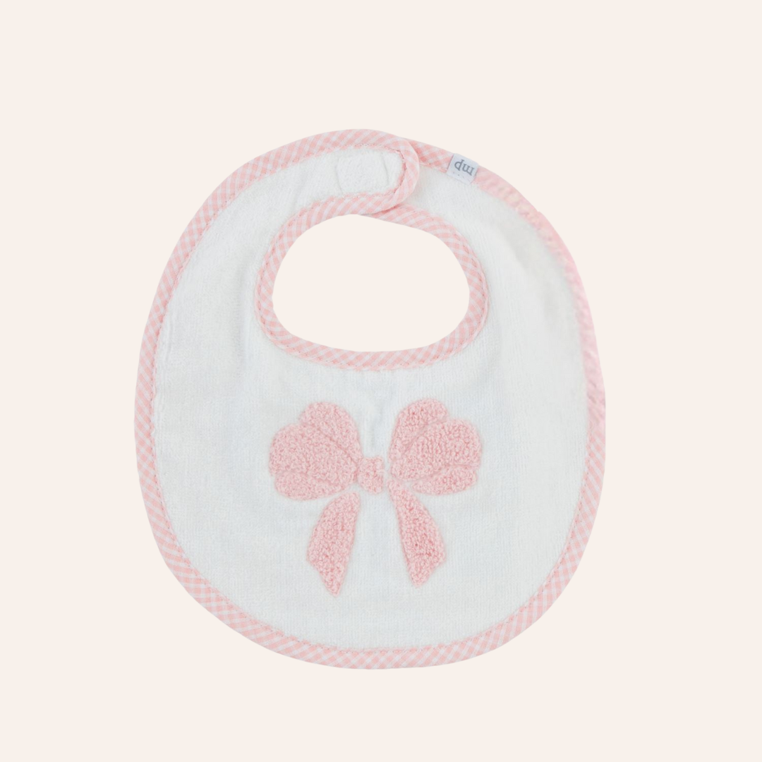 The Boucle Bow Applique Terry Bib is a charming and practical accessory for your little one. This bib is crafted from soft velour terry cloth, providing a gentle touch against delicate skin. It features an adorable boucle bow applique that adds a touch of elegance to mealtime. The contrast gingham binding enhances its visual appeal, making it a stylish choice for any occasion. The bib is designed with a dot minky backing, offering an extra layer of comfort and absorbency. For easy and secure fastening, it includes a convenient hook and loop closure. Measuring 9 1/2" x 8 1/2", this bib is perfectly sized for infants and toddlers. The front is made from 100% cotton, ensuring breathability and softness, while the back is crafted from 100% polyester for durability and easy maintenance.