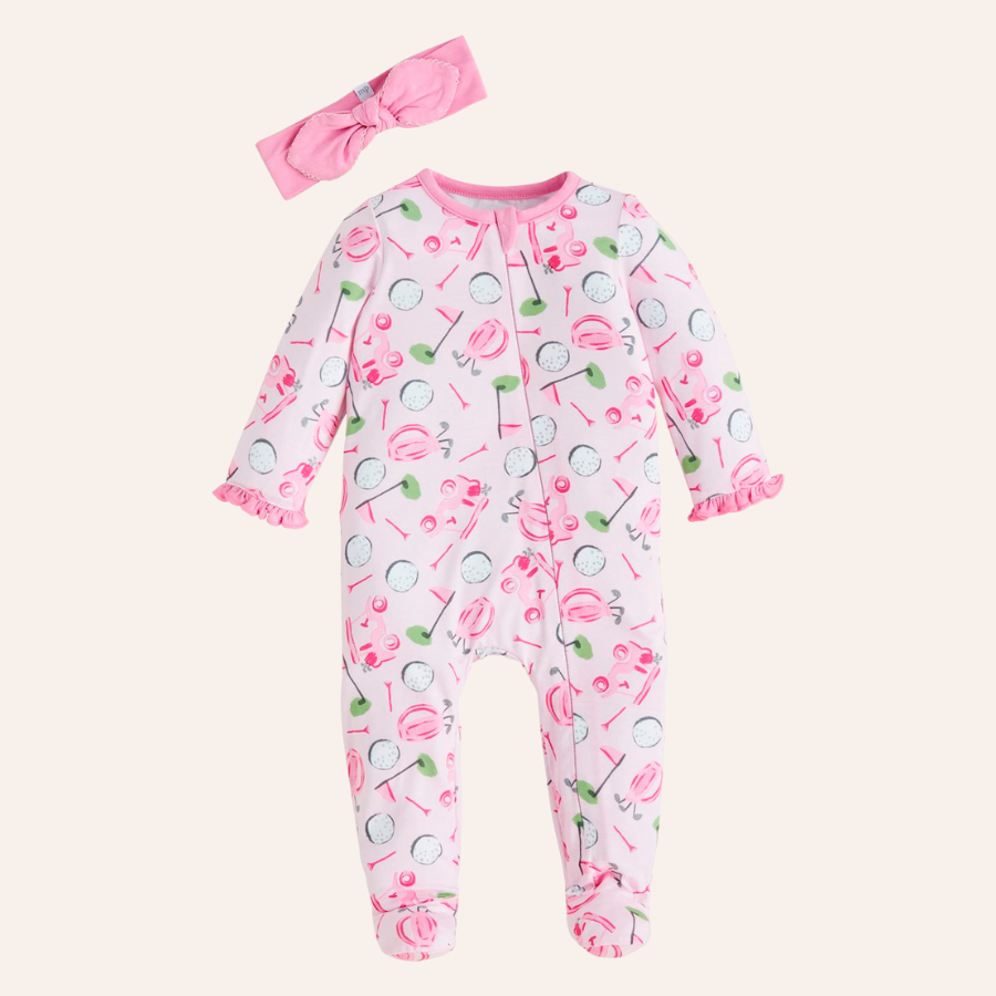 The Pink Golf Baby Sleeper Set is a charming and cozy ensemble perfect for your little one. This delightful 2-piece set includes a knit bamboo footed sleeper that ensures comfort and warmth. The soft and breathable fabric, made from 96% viscose derived from bamboo and 4% spandex, offers a gentle stretch for easy movement. Accompanying the sleeper is an adorable bow headband, adding a touch of sweetness to the outfit. Designed for babies aged 3-6 months, this set combines style and practicality, making it an ideal choice for both sleep and play.