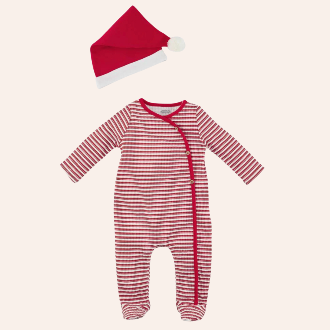 2-piece set. Cotton rib footed sleeper with wood button kimono placket. Comes with Santa hat.