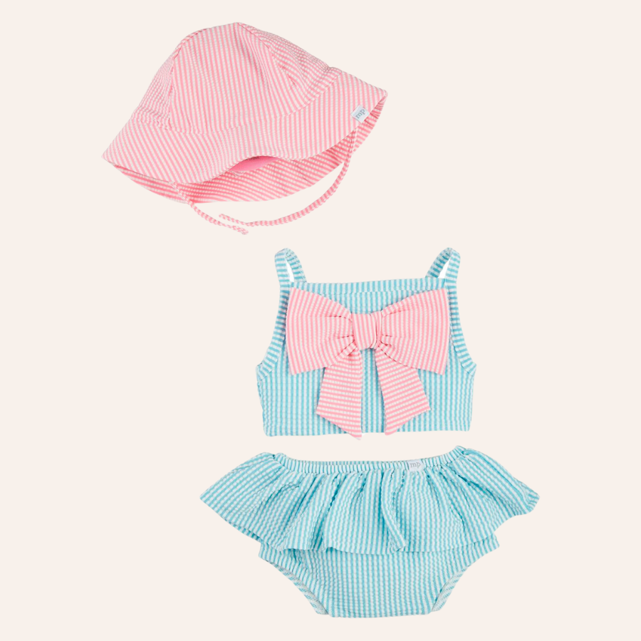 This adorable Girls' Seersucker Swimsuit Set is perfect for your little one's beach or pool adventures. The charming 3-piece set includes a stylish two-piece swimsuit crafted from a soft and stretchy nylon spandex seersucker fabric, ensuring comfort and ease of movement. The swimsuit features a delightful dimensional bow and a playful waist ruffle, adding a touch of elegance and fun to her swimwear. Accompanying the swimsuit is a coordinating sun hat, designed with a convenient chin strap to keep it securely in place, providing extra protection from the sun. The set is available in size 12-18 months, making it an ideal choice for toddlers. The fabric composition of the set includes 50% Polyester, 45% Nylon, and 5% Spandex, while the lining is made of 82% Polyester and 18% Spandex, ensuring durability and a comfortable fit. This swimsuit set is not only practical but also stylish, making it a must-have for your little girl's summer wardrobe.