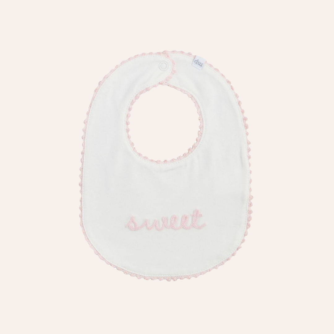 The Sweet Embroidered Pink Bib is a charming and practical accessory for your little one. Crafted from a soft and stretchy cotton spandex blend, this bib ensures comfort and durability. It features delicate chainstitch embroidery that adds a touch of elegance, while the crochet trim provides a classic, handcrafted look. The convenient snap closure makes it easy to put on and take off, ensuring a secure fit. Measuring 9 inches by 6 1/4 inches, this bib offers ample coverage to protect your baby's clothes during mealtime. With its delightful pink hue and thoughtful design, this bib is both a functional and stylish addition to your baby's wardrobe.