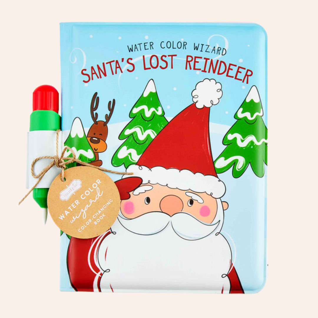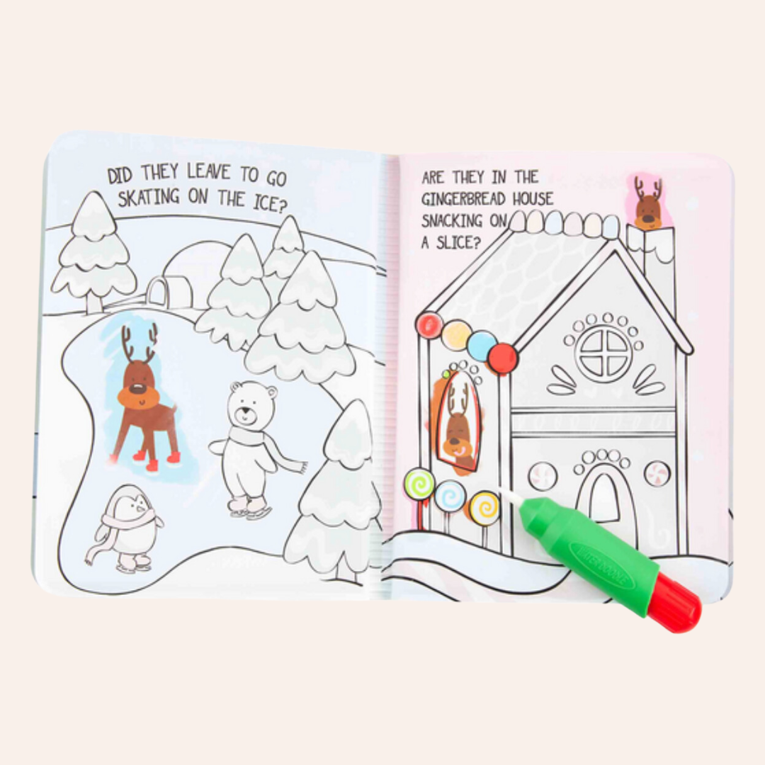 Water activated color changing book comes with water pen. Color the pages to reveal where Santa's lost reindeer are hiding.