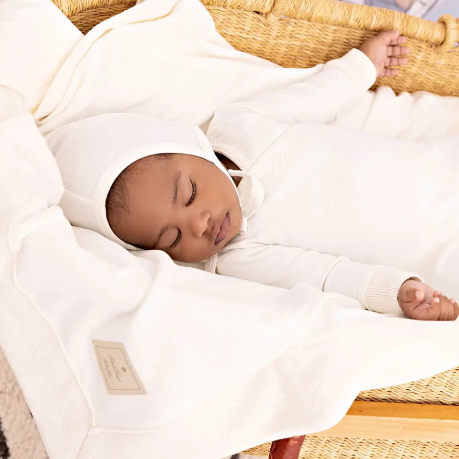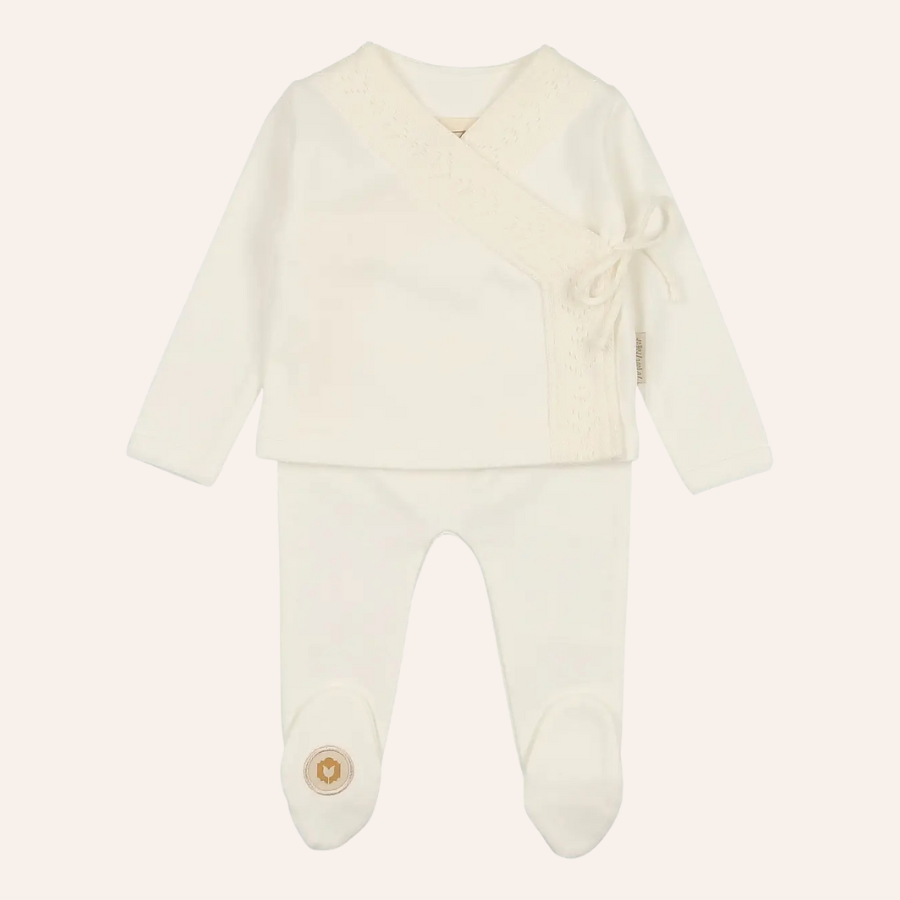This gentle wrap two-piece is constructed of a soft cotton, featuring pointelle trim at the edges and cuffs. Quietly elegant and undeniably dressy, this set ensures the convenience of comfort all day long. Outfit has close feet up until 9 months and open feet for 12 months. Fabric Content: 95% Cotton, 5% Elastane (exclusive of decoration)