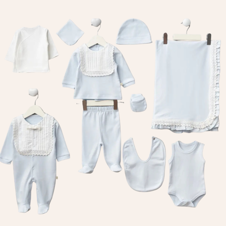 10-Piece Baby Newborn Layette Set – 0-3 Months – Pintuck and Lace Detail – Soft Blue Welcome your little one with timeless elegance using this 10-Piece Newborn Baby Girl Layette Set, thoughtfully designed for babies aged 0-3 months. Crafted in a soft cream color, this luxury set features delicate pintuck and lace detailing for a classic, heirloom-inspired look.Made from ultra-soft, baby-friendly fabric, the set includes all essentials for newborn comfort and style: