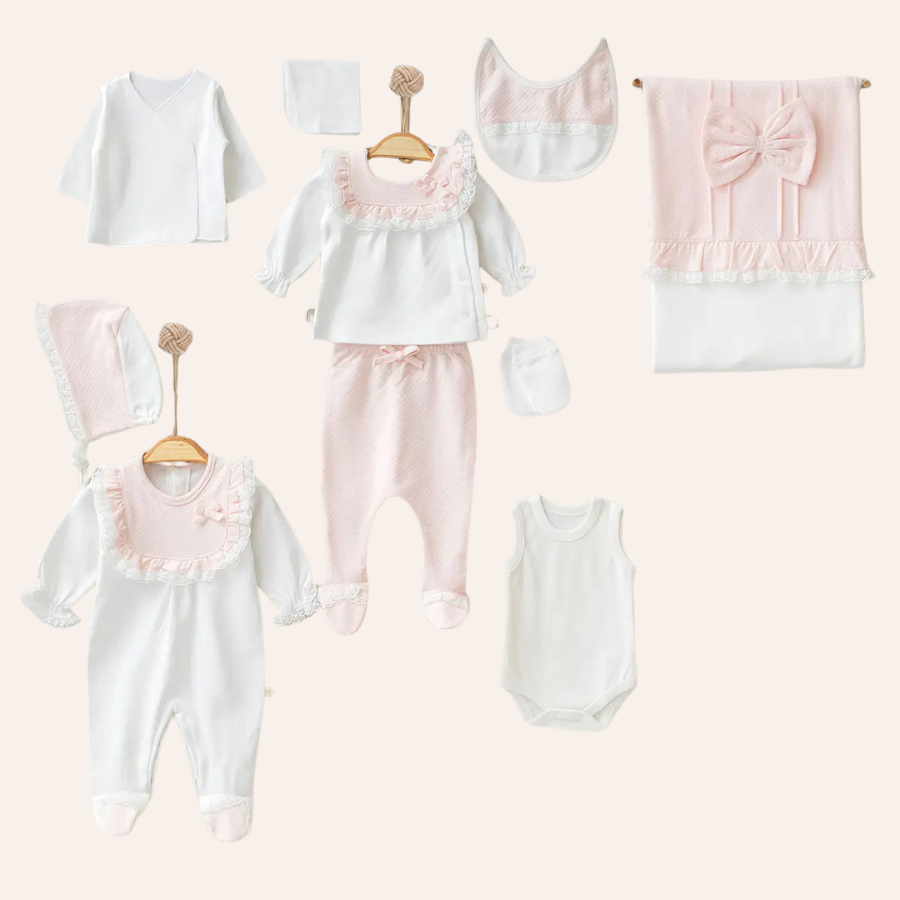 Luxury 10-Piece Jacquard Baby Gift Set – Pink & White Wrap your newborn in comfort and elegance with our Luxury 10-Piece Jacquard Baby Gift Set in delicate pink and white tones. Crafted from ultra-soft, breathable cotton fabric, this premium newborn set includes everything a baby needs in their first days. The elegant jacquard texture, lace details, and pastel colors make it the perfect choice for hospital exits, special occasions, or as a thoughtful baby shower gift.