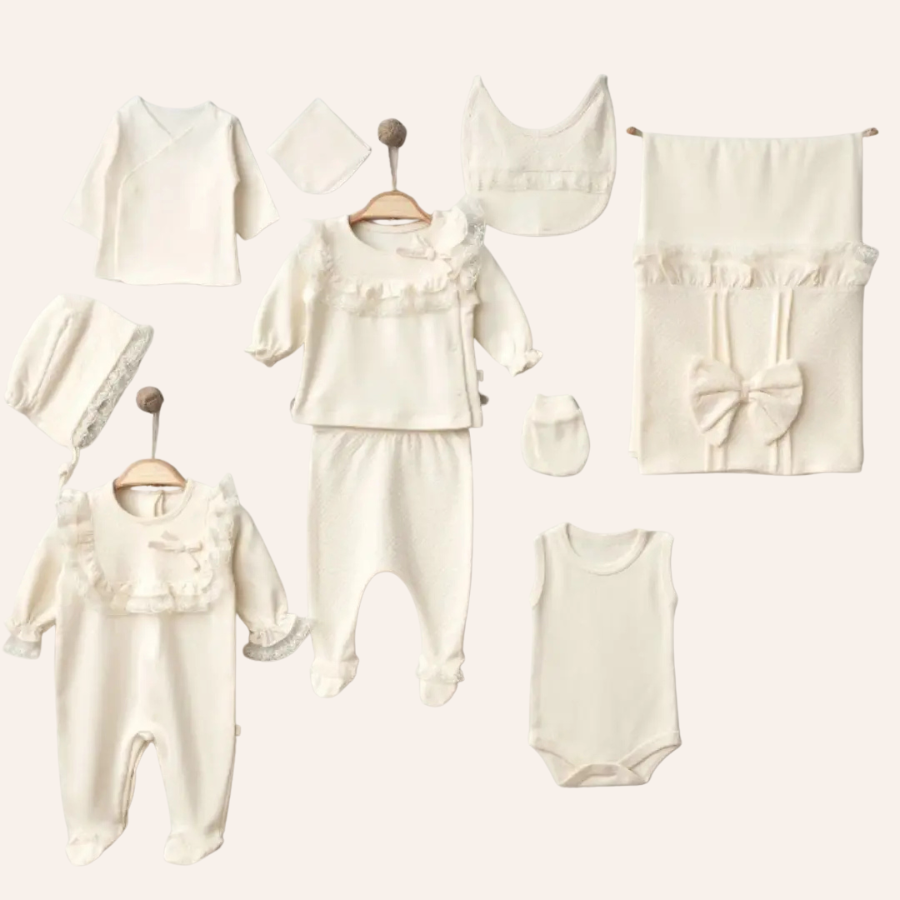 10-Piece Premium Cotton Baby Girl Gift Set – White & Soft Pink | Ideal Baby Shower & Coming Home Set.This 10-piece premium newborn baby girl set is a timeless and thoughtful choice for baby showers, coming home outfits, or newborn essentials. Crafted from 100% high-quality cotton, this custom-made set offers a dense texture, ultra-soft feel, and gentle touch for the most sensitive newborn skin..The elegant white and soft pink color palette is enriched with coordinated textures and fabric styles, creating a beautiful and harmonious design. Scalloped edges and a classic-style collar bring vintage charm to this heirloom-quality set. What’s Inside:80x100 cm Cotton Blanket – soft and breathable with scalloped edges.2-Piece PJ Set – cozy and gentle for sleep or lounging.Long Sleeve Bodysuit – with snap fasteners for easy changing.Plain White Sleeveless Bodysuit – perfect for layering. Girl’s Hat with Frills – stylish and snug. Envelope Jacket – classic style, Bib, Handkerchief.