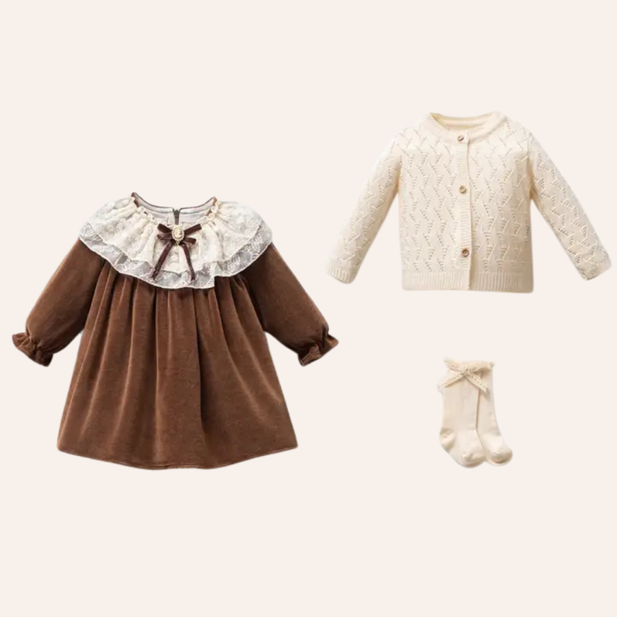 Dress your little one in timeless charm with this adorable 3-piece set, featuring a soft velvet dress paired with a cozy knitted cardigan. Perfect for special occasions or everyday elegance. Sized for 3–6 months.