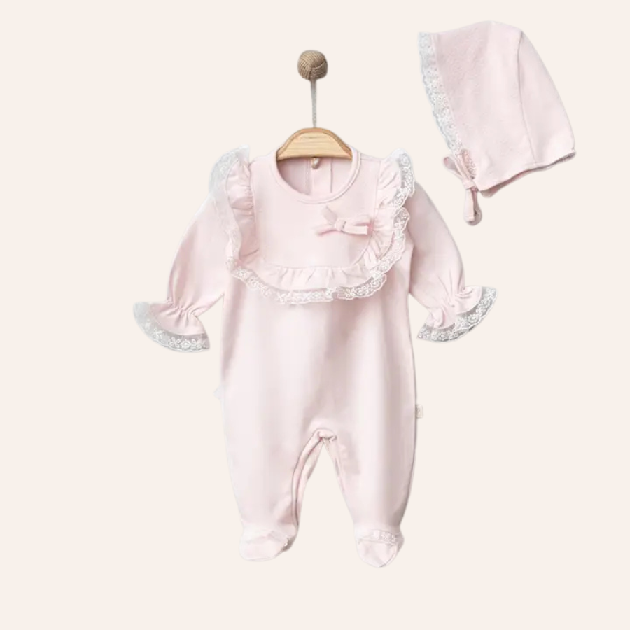 Sweet and stylish, this pink cotton onesie features a special collar detail and comes with a matching bonnet. The perfect outfit for your baby girl, available in sizes 0–3M, 3–6M, and 6–9M.