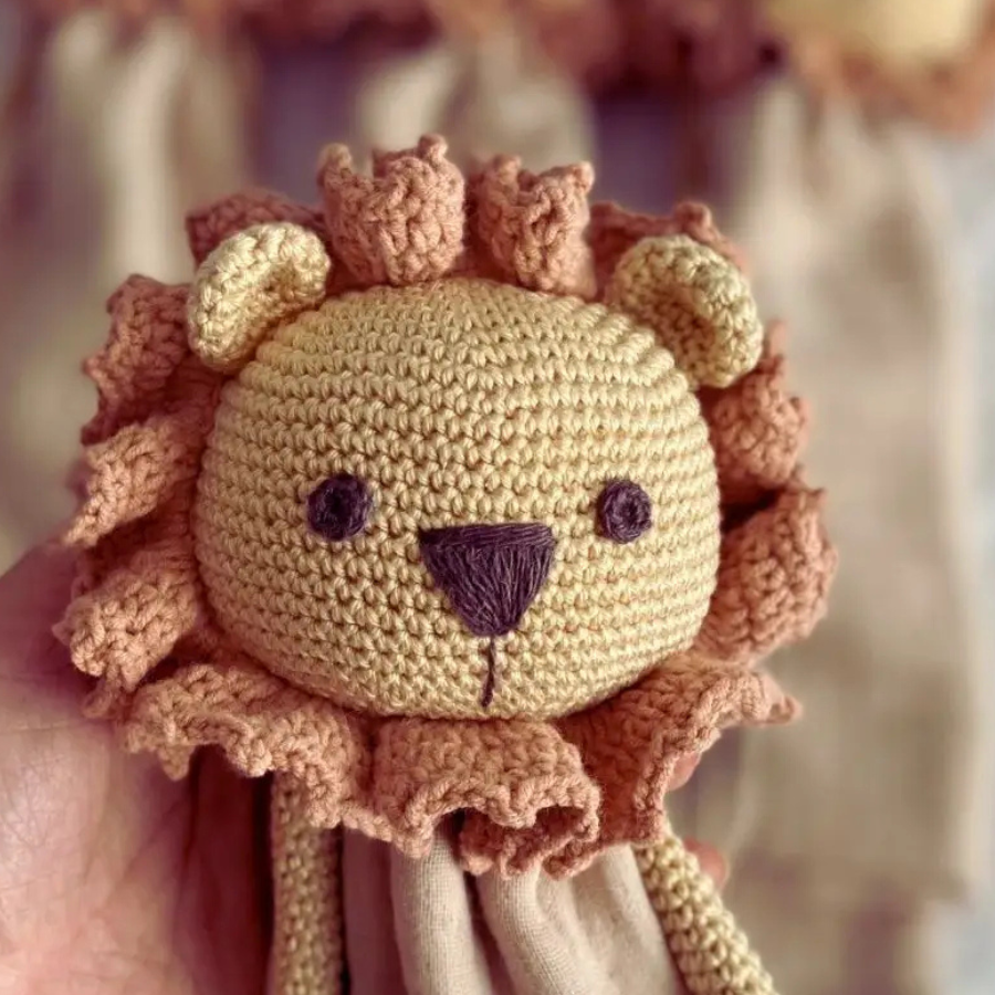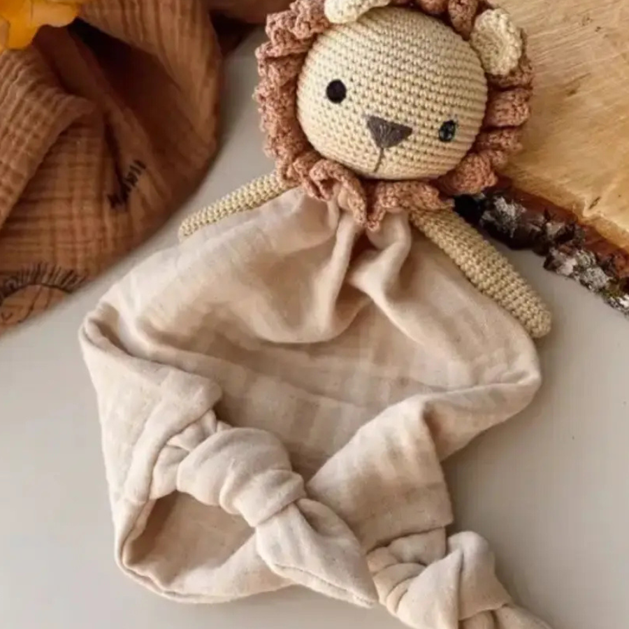 Organic Cotton Handmade Crotchet Lion Newborn Muslin Sleep Friend. For the perfect gift for a new baby, look no further than our beautifully designed comforters. A cute sleep companion for babies! Each line of the product is carefully prepared. The perfect gift for your loved ones. 100% cotton, GOTS certified organic muslin fabric. The Yarn is made from 100% cotton-EN71-3 Certified. Beige colour, yarn colours may slightly change* You can wash it by hand at 30 degrees and dry it on a flat surface after washing. It does not contain harmful chemicals.