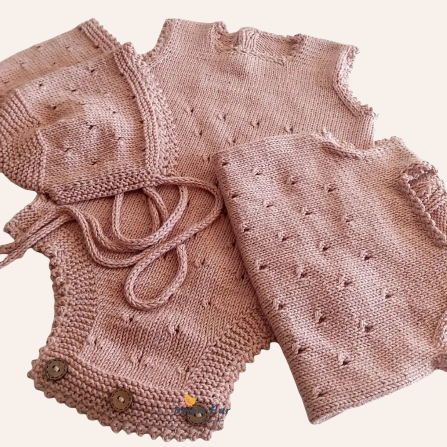 Discover the exquisite Organic Vintage Hand Knitted Baby Girl Romper & Bonnet, exclusively at Omnis Pura, your go-to source for premium organic baby hand knit collection. This elegant set features a hand-knitted baby romper and a bonnet, crafted with GOTS Certified 100% Organic Cotton. The romper showcases a modern yet classic design with a sweet pattern and unique slightly frill edge details, finished with easy-to-use coconut buttons at the bottom. Perfect for parents who value sustainability and sophistication, this classy combination ensures your little one looks adorable while feeling comfortable.* Skin friendly for sensitive skin of children.* Do not cause any allergic reactions, itching on baby and body skin. *Two different natural colour designs: Powder Pink and Ivory colour.*Perfect unisex gift, heartful design, can be used anywhere, anytime!