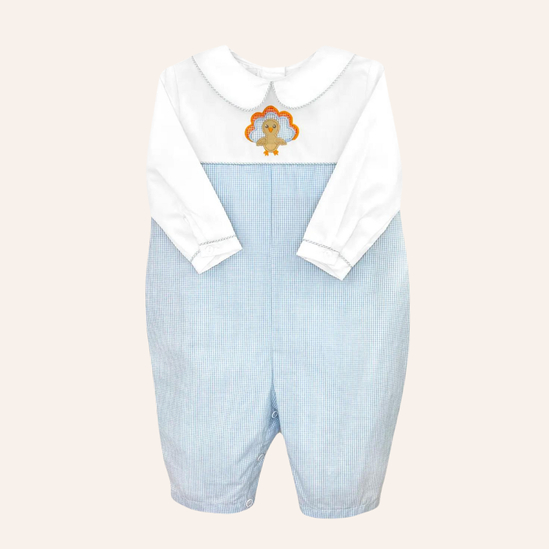 This adorable longall comes in a blue check fabric with a white top with a friendly turkey applique and a peter pan collar with blue check trimmed edges for an extra touch of detail.