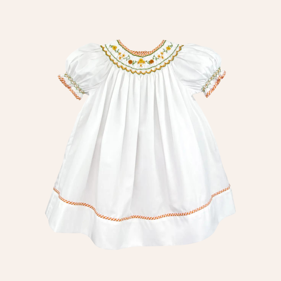 Our harvest bishop smocked dress comes in a soft white fabric with floral smocking in an orange fall color scheme. This short sleeve dress is made with a cotton-poly blend fabric that is lightweight, airy and machine washable for easy care!