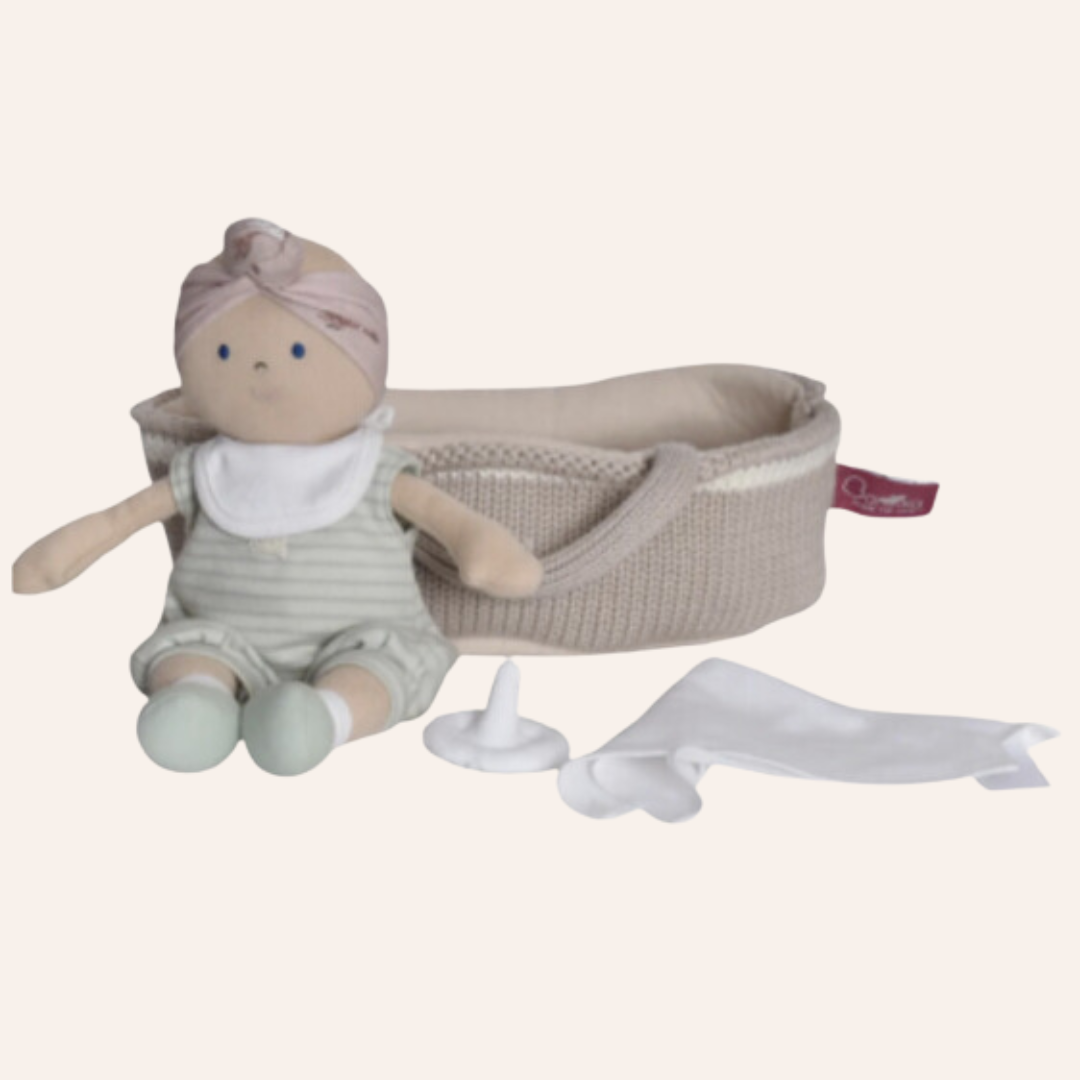 A beautiful choice for babies, toddlers and older kids alike, our fabric baby doll comes with a cute bandana, knitted carry cot, soother, bib and a blanket. Designed to help little ones self soothe, these dolls are wonderful and safe choices for babies and toddlers. Older kids will love the experience of looking after the baby which also helps develop empathy and social skills. Soft and cuddly these dolls are a darling choice for little ones.