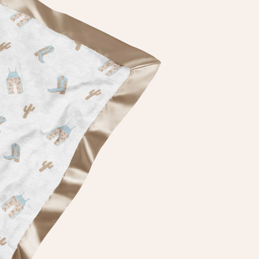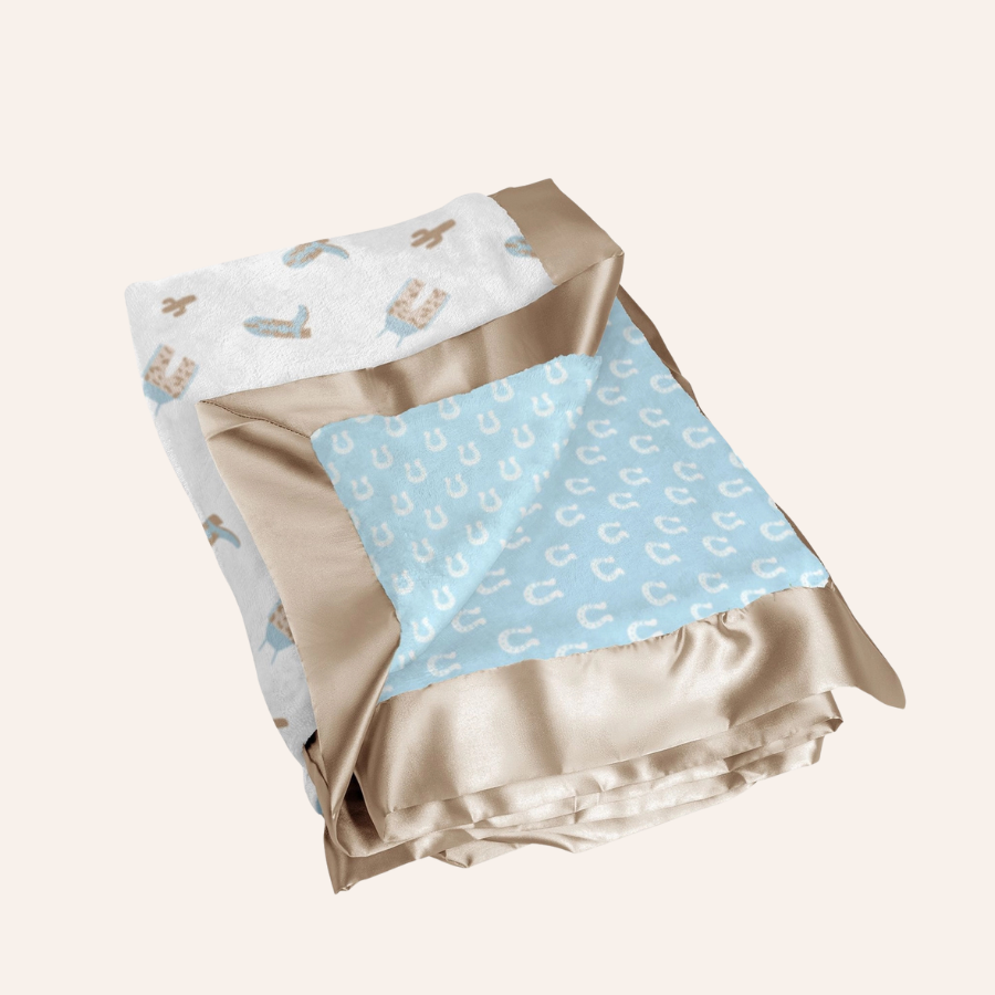 With ultra-soft, thick fabric and a silky satin trim, the double-layered Reversible Baby Blanket from JuJuBe × Studio Oh! is a plush addition to any nursery. Each side displays a soothing, pastel color palette with adorable coordinating patterns, such as sweet cherries and dots and cowboy boots and lucky horseshoes. Machine washable with a comfortable, durable construction, these luxurious reversible blankets measure 30 by 40 inches (76.2 cm × 101.6 cm) and are ideal for keeping warm around the house or on the go and for tummy time on the floor.