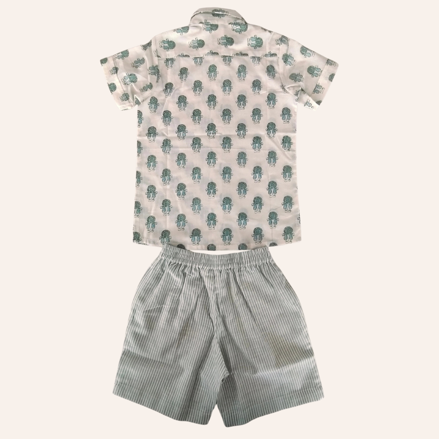 Sage Print Cotton Shirt & Stripe Shorts Set