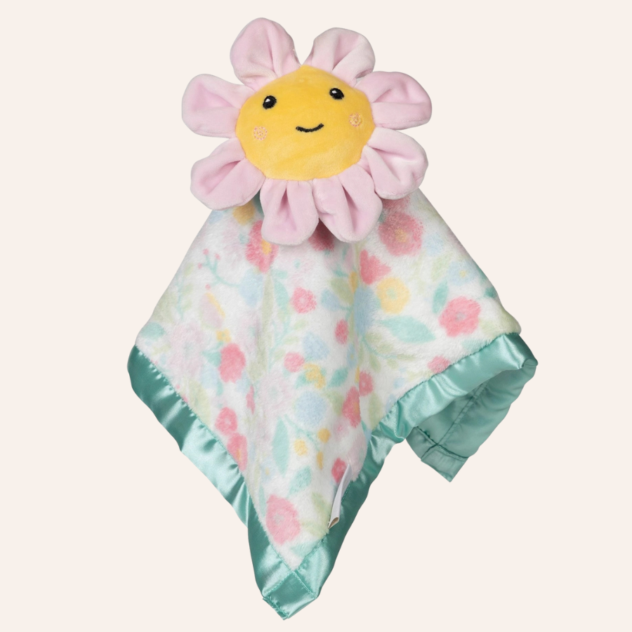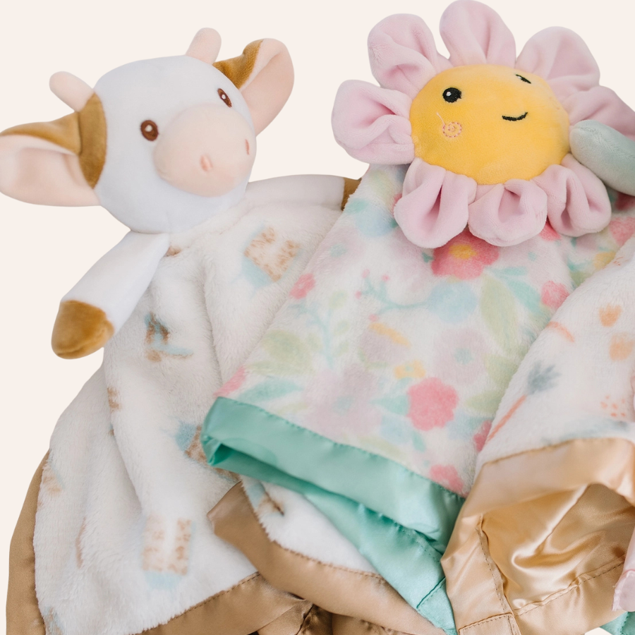 • Includes a plush character atop a petite handkerchief-shaped blanket with coordinating designs • Features ultra-soft fleece with satin trim and underlay to provide warm, soothing comfort