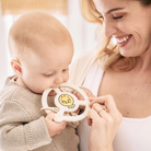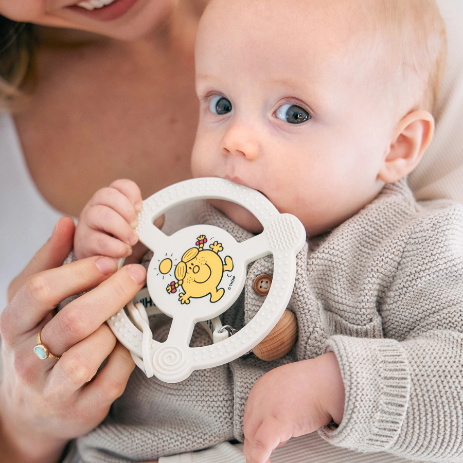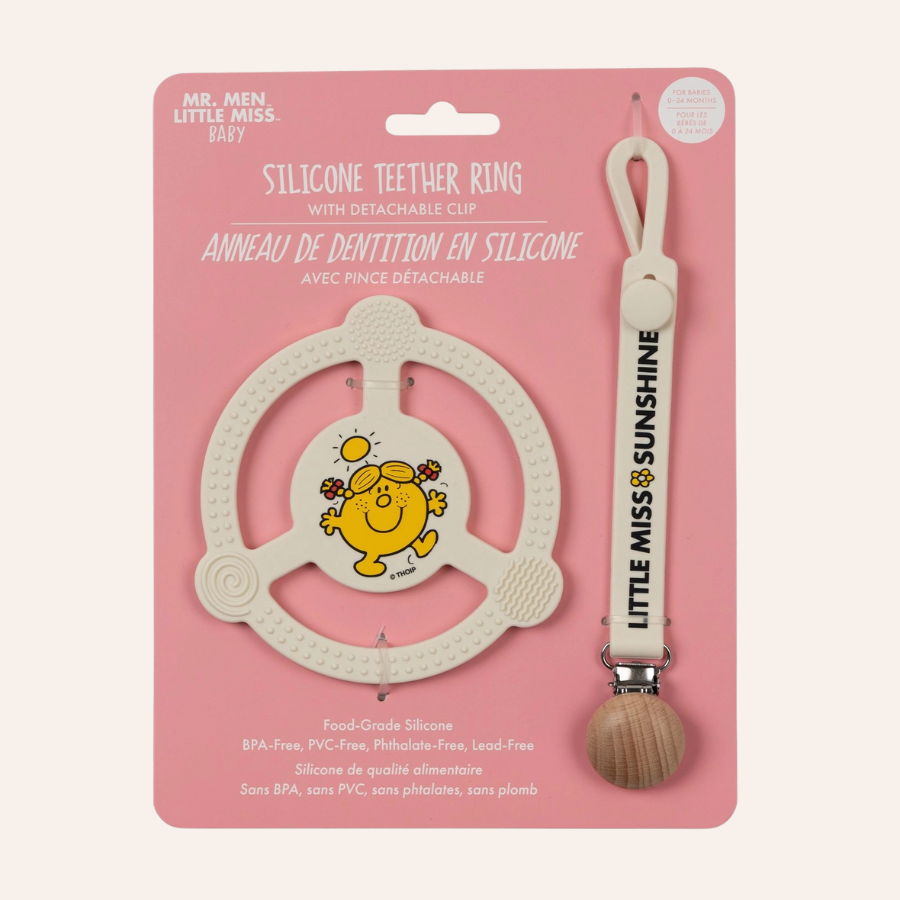 Help soothe Baby's sore gums with the Silicone Teether Ring with Detachable Clip from JuJuBe x Studio Oh! This teether features the iconic Little Miss Sunshine character from Mr. Men Little Miss™, adding a cheerful companion to your little one's teething journey. Its easy-to-grip design and three different massaging textures allow Baby to choose what feels best. Place it in the freezer before use for additional cooling relief. This food-grade silicone teether is dishwasher-safe, and most importantly, it is BPA-free, PVC-free, phthalate-free, and lead-free, making it safe to go in Baby’s mouth.
