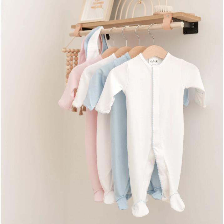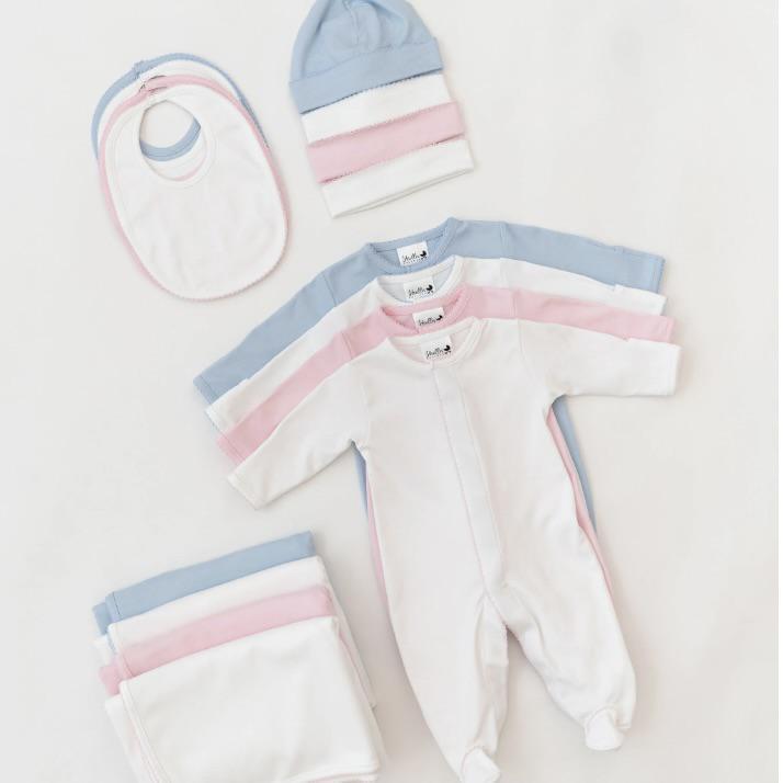 Our Premium Pima Cotton Newborn set comes with a footie, hat, bib and blanket. This luxurious material is ideal for personalization and monogramming. The set makes the perfect baby gift for newborn baby girls and newborn baby boys. Choose from Baby Pink, Baby Blue, White with Baby Pink picot trim or White with Baby Blue picot trim. This lovely set is a great choice for a newborn coming home from the hospital set.