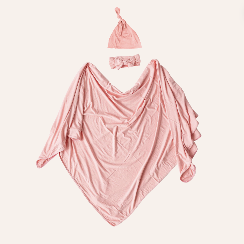 The Stroller Society pink stretch knit swaddle blanket, hat and headband are extremely soft, lightweight and breathable. The baby blanket’s large 47” by 47” size makes it perfect for swaddling, useful as a receiving blanket and it can also be used into the toddler years. The newborn headband and hat are ideal for infants ages newborn to 3 months old and looks great in photos! This bundle is perfect for baby girls and makes the perfect baby gift!