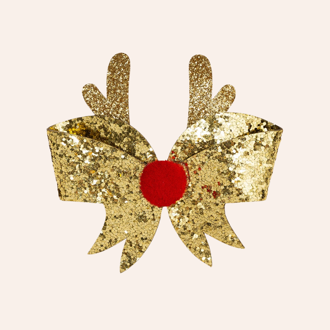 * Gold glitter bow with red pom-pom accent and gold glitter antlers
