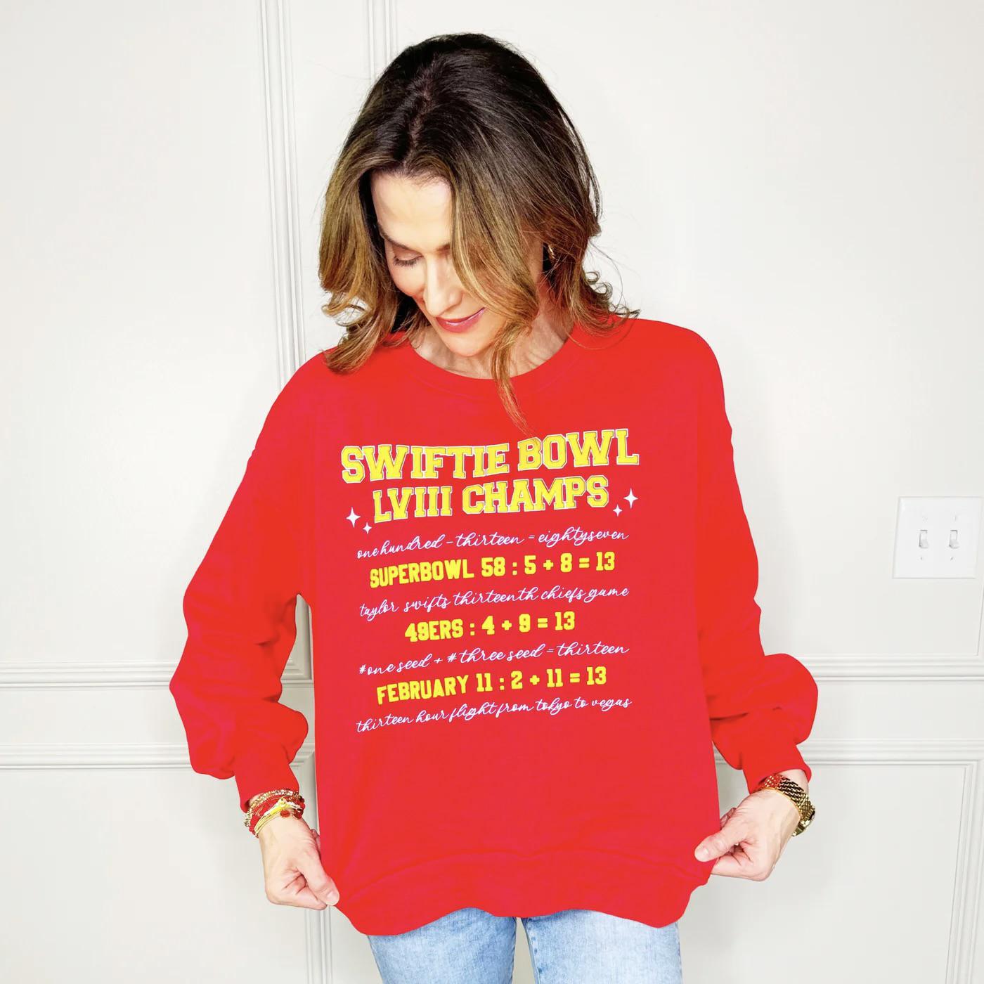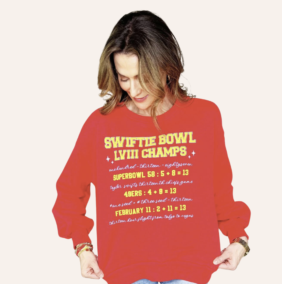 Get ready to celebrate like a true super fan with the Swiftie Bowl 13 P&P Sweatshirt! Show off your love for the Chiefs and their recent Super Bowl victory in this quirky and playful sweatshirt. Guaranteed to make a statement wherever you go. Game on!