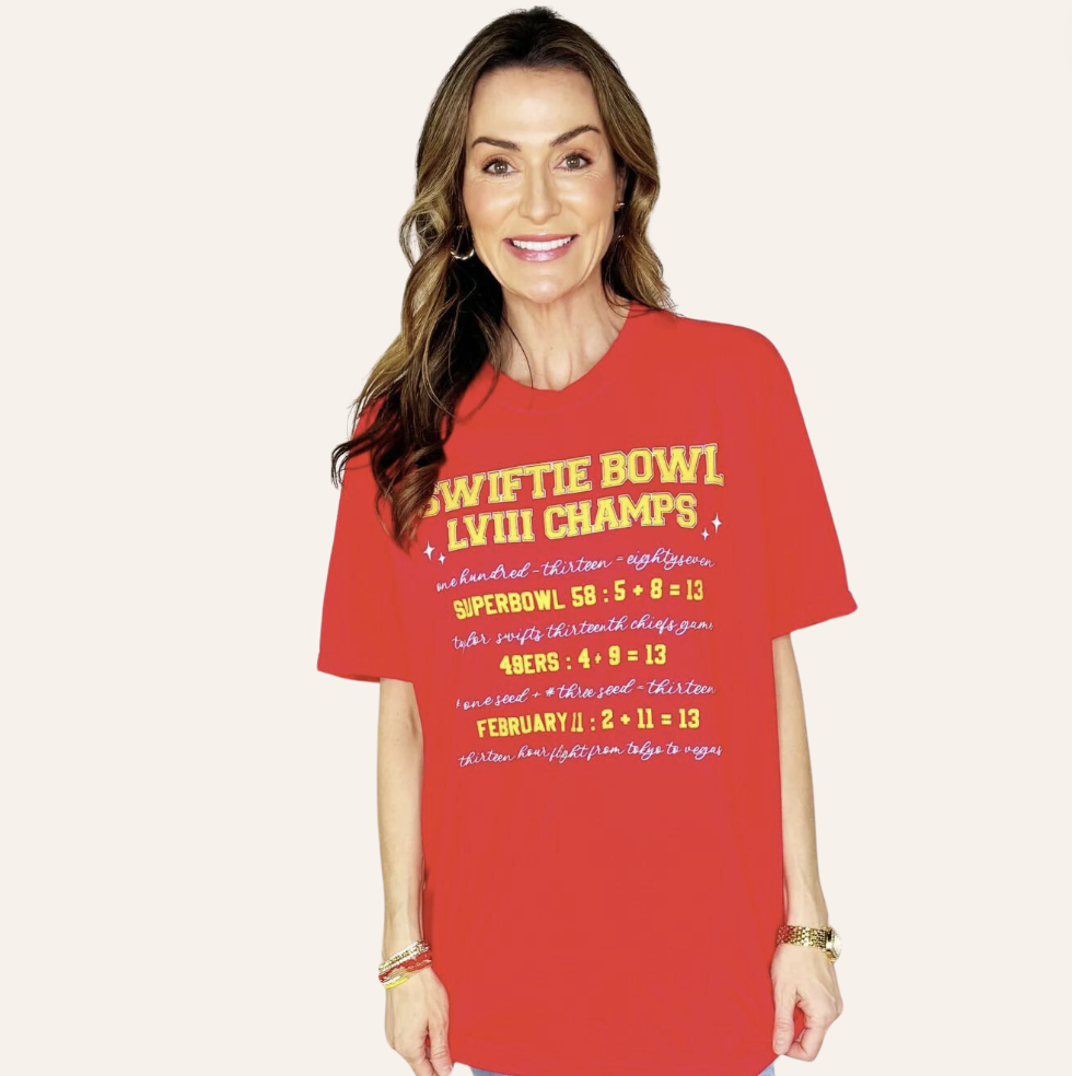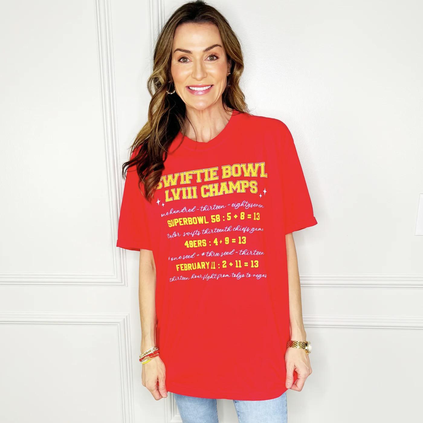 Score a touchdown with the Swiftie Bowl 13 Tee, perfect for fans of the Chiefs and this year's Super Bowl champs! Show your team spirit and celebrate the big win in style with this playful and quirky tee. Go chiefs!