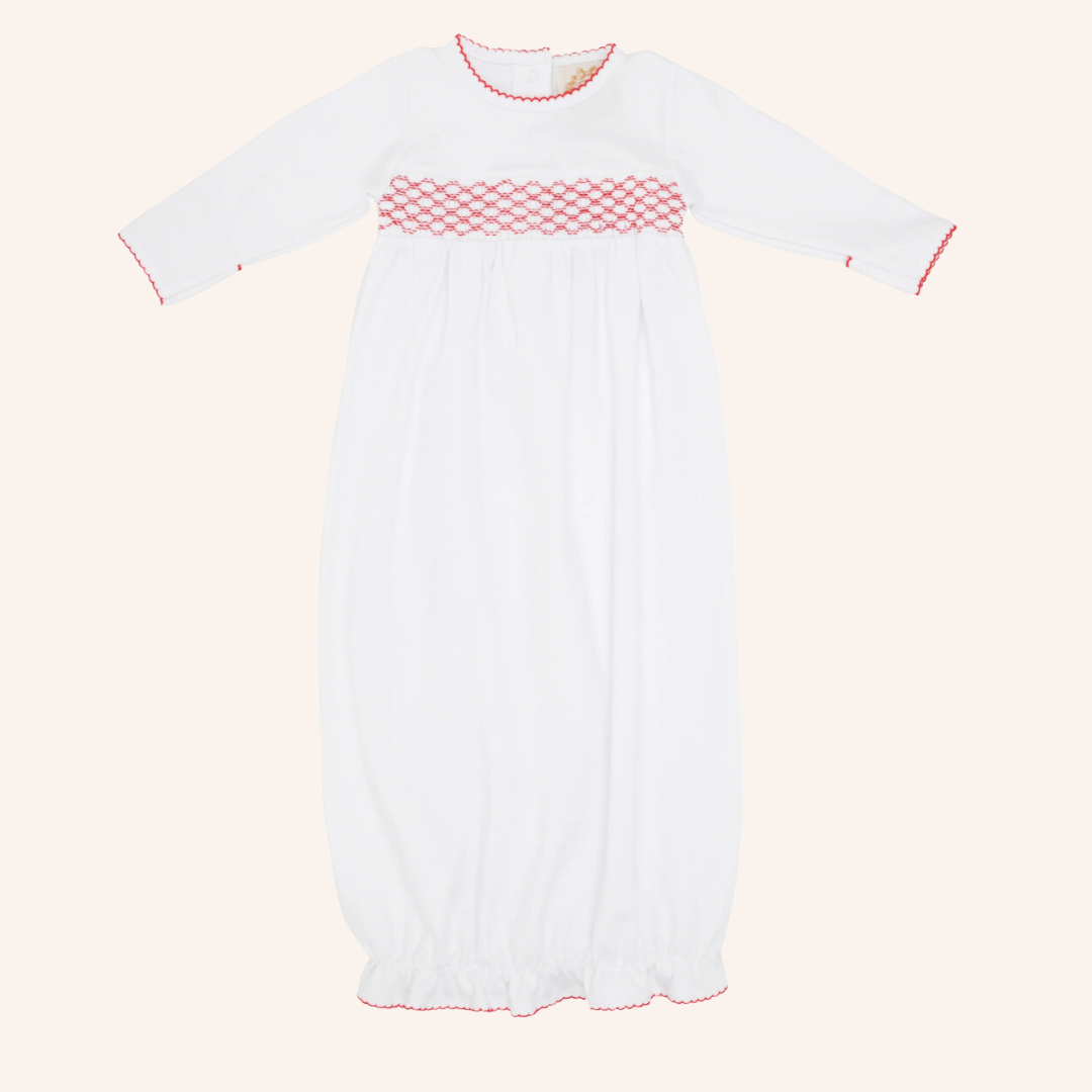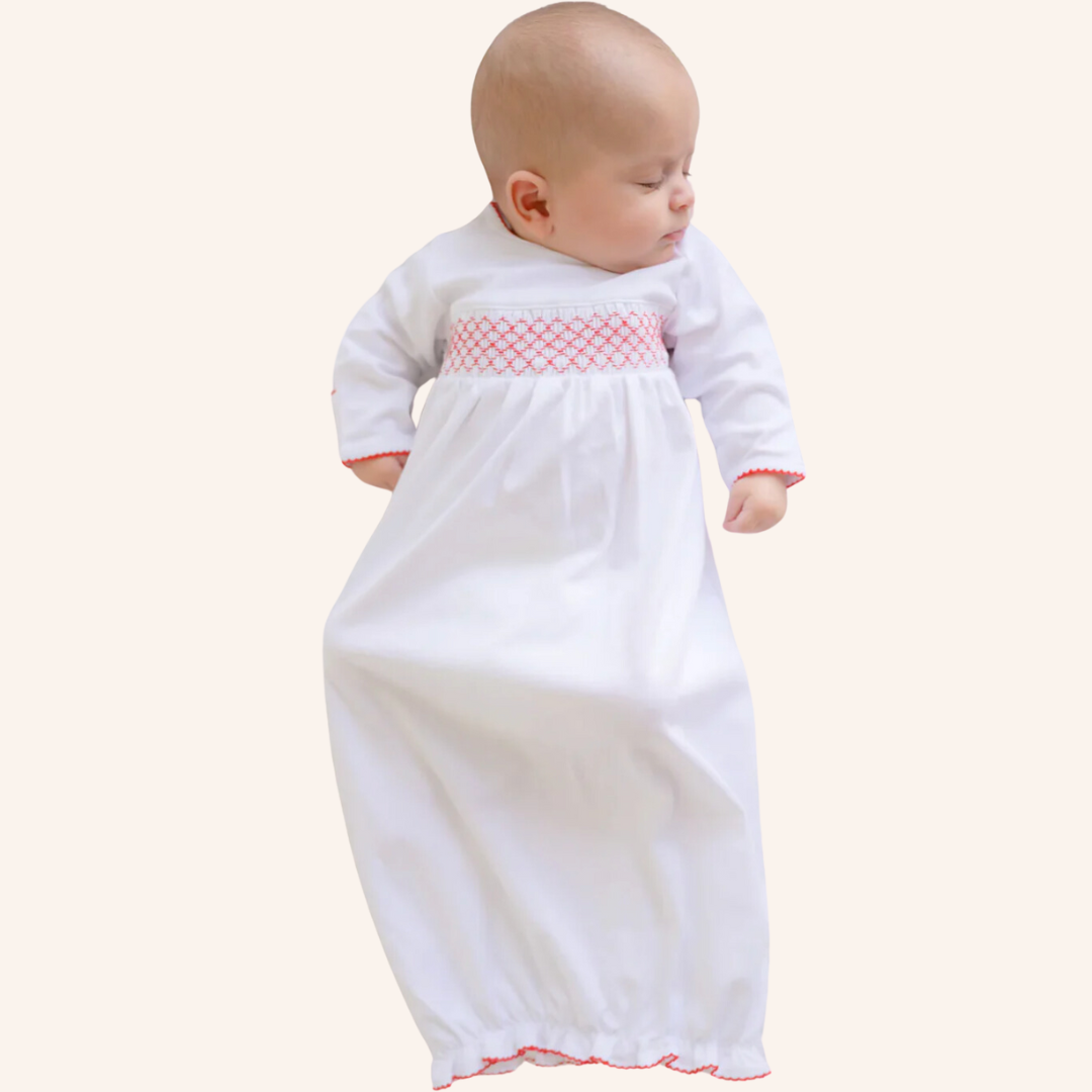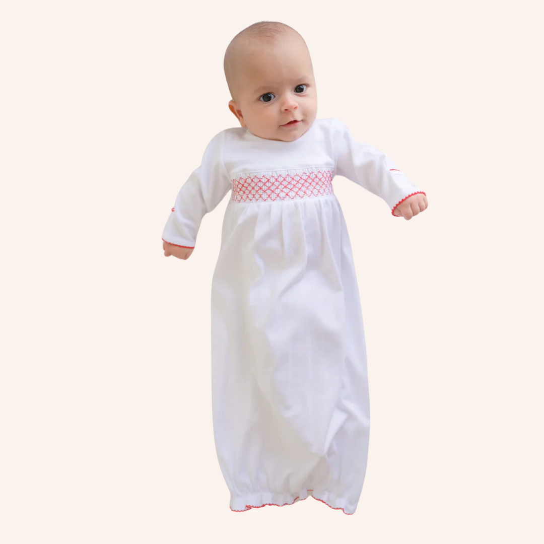 The Sweetly Smocked Greeting Gown is the perfect day gown for your bundle of joy! From the stunning Richmond Red smocking to the sweet sleeve details, this gown is a necessity for your little one!