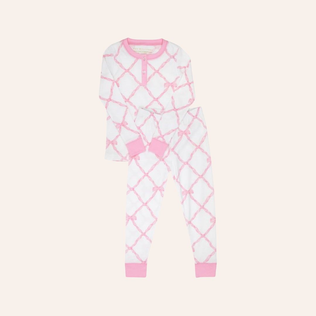 The softest and sweetest pajamas in the whole wide world, our Sara Jane's Sweet Dream Set in Belle Meade Bow with Palm Beach Pink is what sweet dreams are made of!