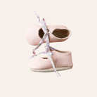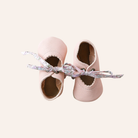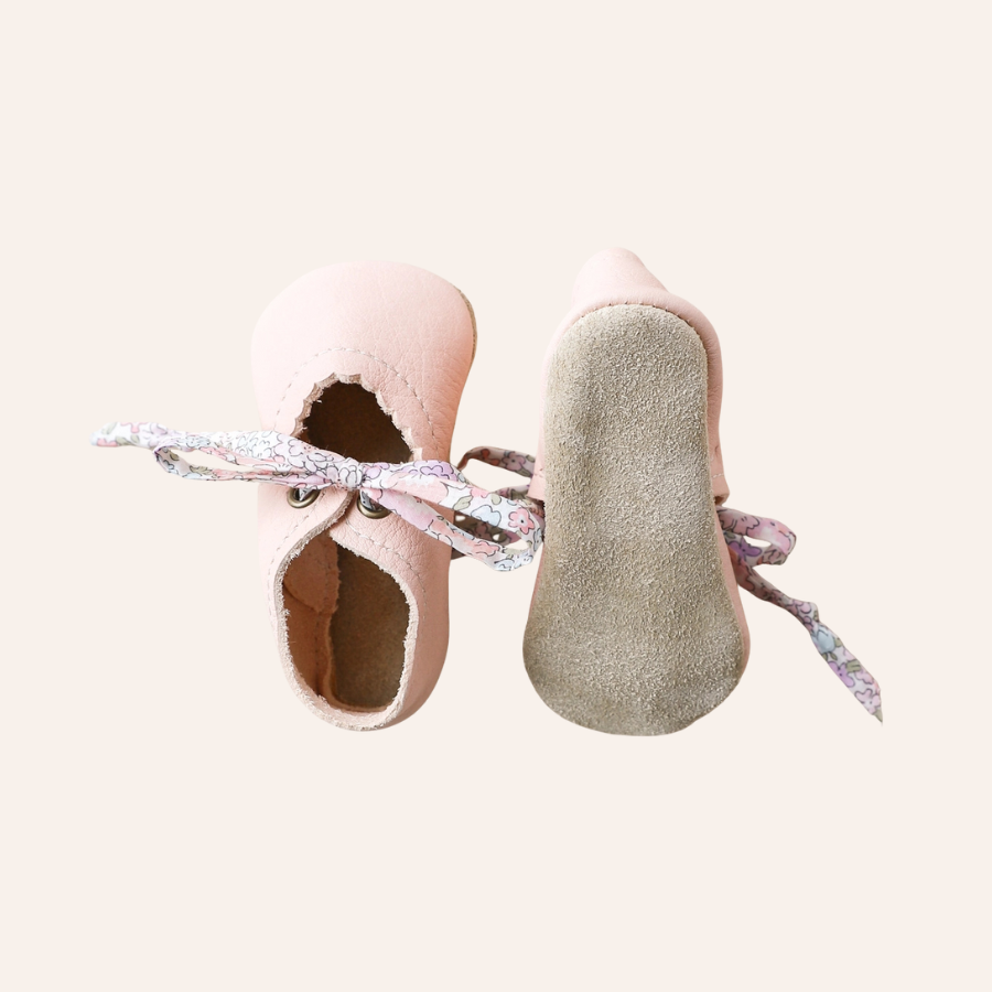 Our signature Bella Janes are made with soft genuine leather. The floral fabric laces have pastel pink and in floral elements on a white background. The soft soles are made of suede in a sand color.