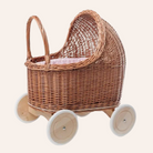 Natural Wicker Pram With Wooden Handle And Cotton Bedding For Doll, Vintage Style, Toddler Girl Gift, Vintage Style Toy For Girl