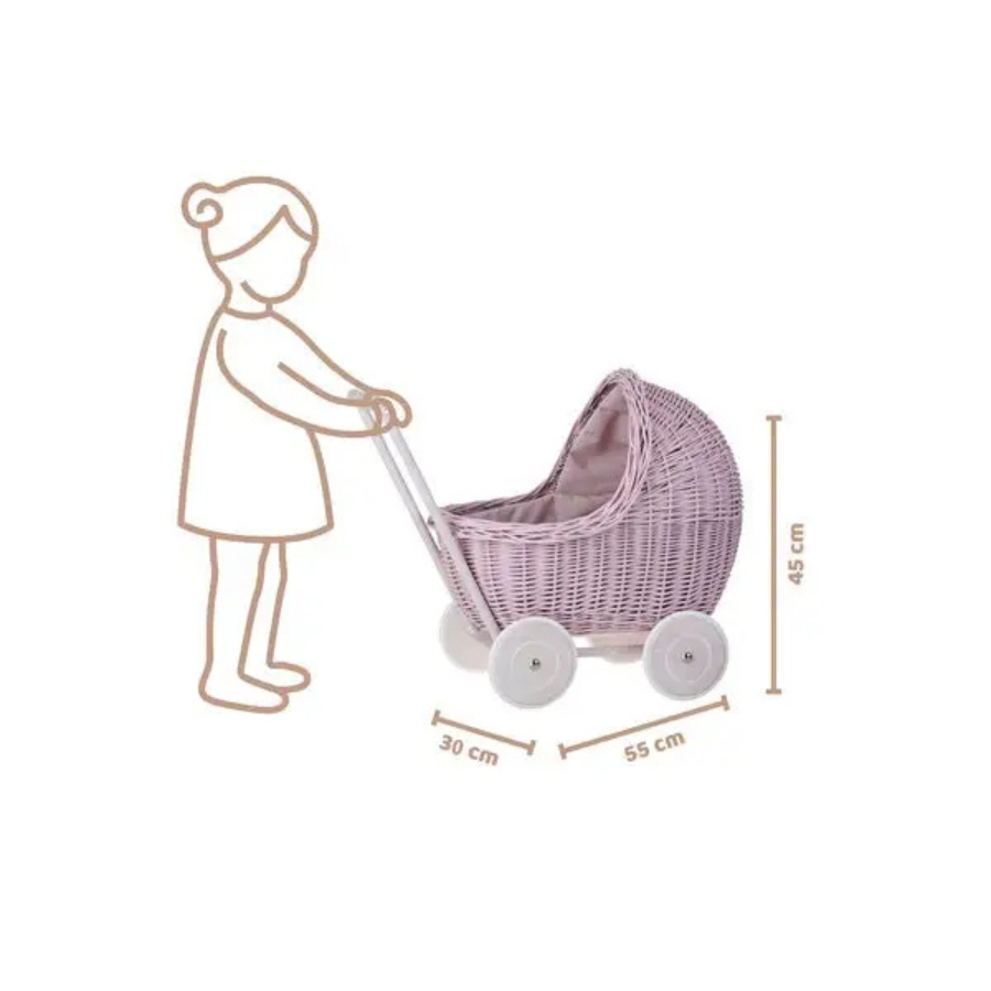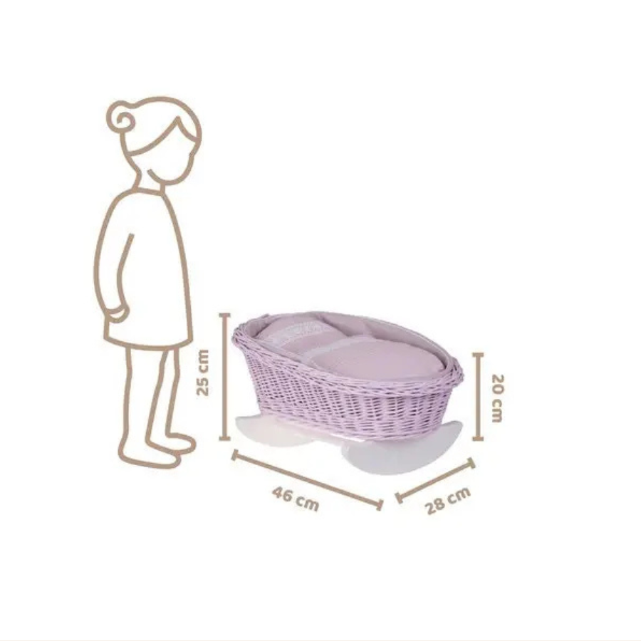 Cradle dimensions: Length: 46 cm Width: 28 cm Height: 20/25 cm Can accommodate a doll up to 37 cm long. Natural materials: wicker, cotton, wood.